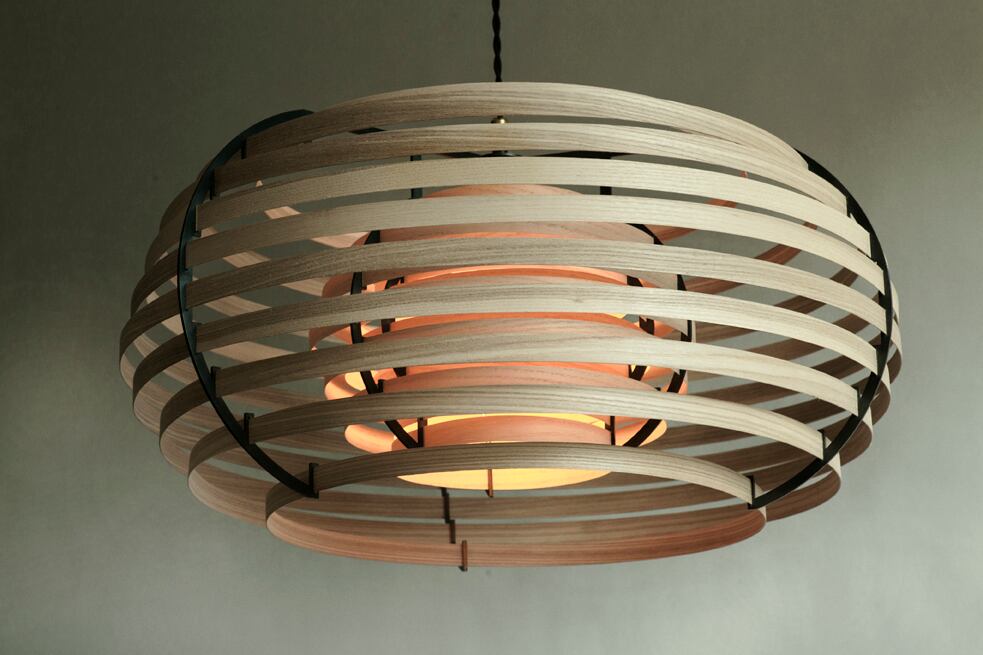 Brian Kirkの中で最も成功を収めたカークの代表的なペンダントランプがMOON( ムー ン)です。木製のシンプルな帯状のデザインで構成されたこのランプは、太陽の光が葉や木々を照らしているときに生み出されるユニークな模様と影を描く日本の概念「木漏れ日」に触発されています。